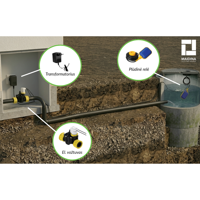 Kā tas darbojas? Peldējošais relejs uzrauga ūdens līmeni akā. Kad līmenis nokrītas zem noteiktās robežas - relejs dod signālu, transformators baro elektromagnētisko vārstu, un ūdens padeve sākas. Sasniedzot vēlamo līmeni - sistēma automātiski izslēdzas.