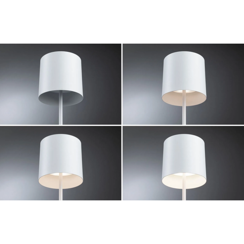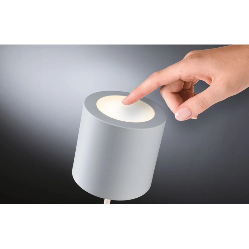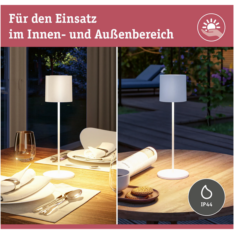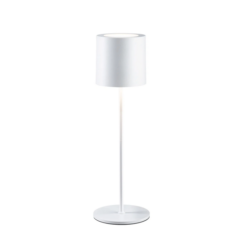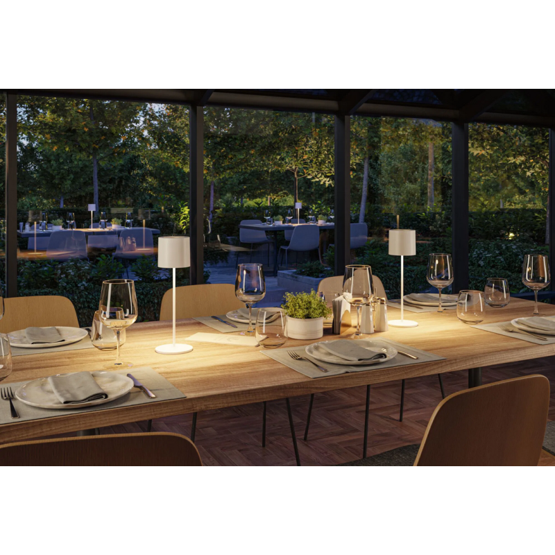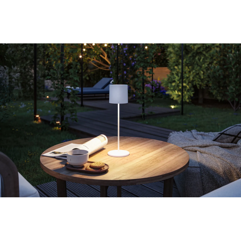 Mobilā LED akumulatora galda lampa Tuni – IP44, kompakta un universāla. Ar kompaktām izmēriem – 105 x 350 mm – lampa lieliski piemērota gan mājām, gan āra telpām. IP44 aizsardzība nodrošina drošu lietošanu ārā: uz terases, balkona vai pat kempingā.
