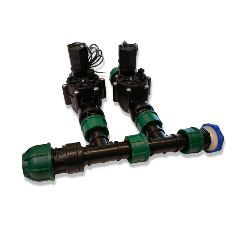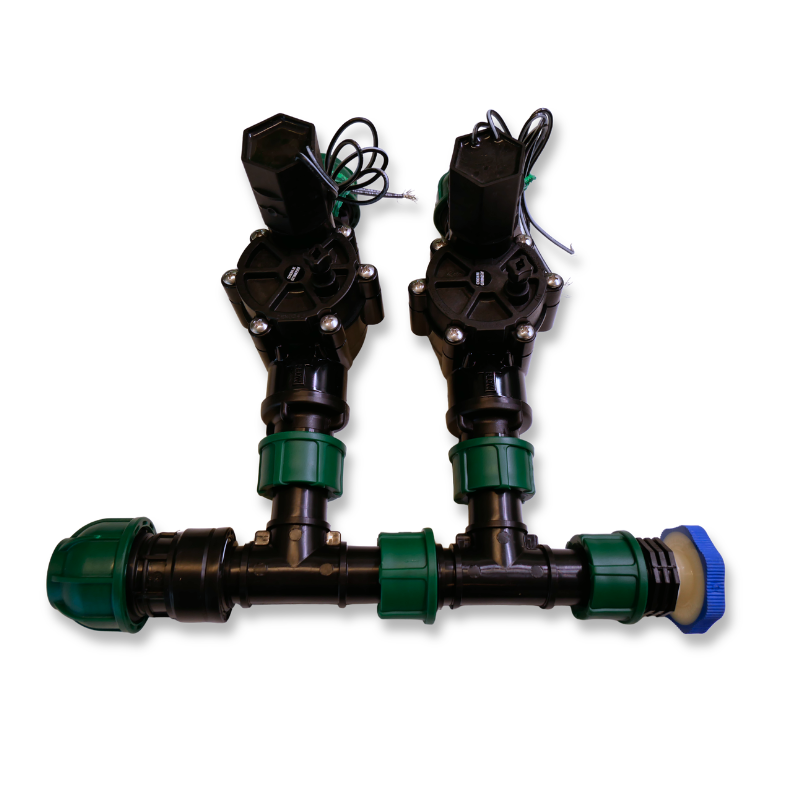 - Komplektā ietilpst: elektromagnētiskie vārsti Rain Bird 100-DV 24 VAC, kolektora savienojumi, PP savienojumi, vītņu savienojumi, drenāžas vārsts.