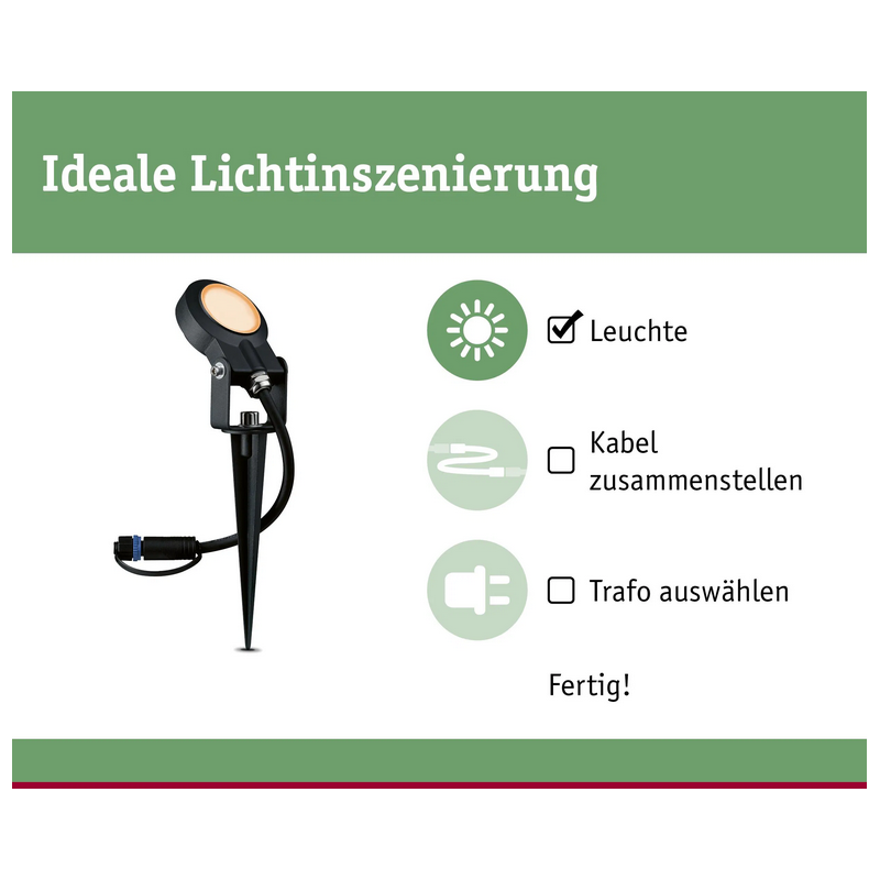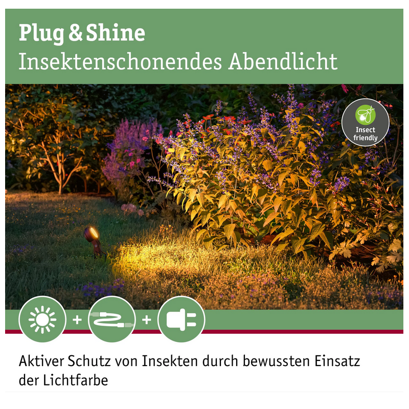 Paulmann „Plug & Shine" ir uzticama āra apgaismojuma sistēma, kas izstrādāta vienkāršai uzstādīšanai un drošai ekspluatācijai. Sistēmā tiek izmantoti speciāli 24 V kabeļi ar IP68 aizsardzību - izturīgi pret mitrumu un piemēroti gan virszemes izvietošanai, gan ierakšanai līdz ieteicamajam 20 cm dziļumam. Vairāki gaismekļi vai piederumi tiek savienoti ar ātrām ūdensnecaurlaidīgām savienotājierīcēm - bez sarežģītiem elektroinstalācijas darbiem. Sistēmu viegli paplašināt: jebkurā laikā var pievienot papildu gaismekļus vai kontrolierus. Īsāk sakot: Paulmann „Plug & Shine" - droša, elastīga un ilgmūžīga āra apgaismojuma sistēma, ko ir vienkārši uzstādīt un paplašināt pēc vajadzības.