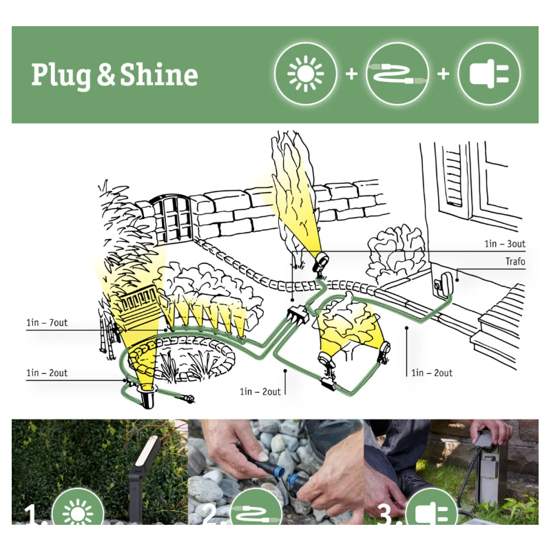 Paulmann „Plug & Shine“ - ļoti uzticama āra apgaismojuma sistēma, izstrādāta tā, lai montāža būtu vienkārša, bet pati uzstādīšana - droša. Šajā sērijā tiek izmantoti speciāli Paulmann 24 V kabeļi, kas ir izturīgi pret mitrumu un var tikt vilkti gan zemē, gan virs tās.