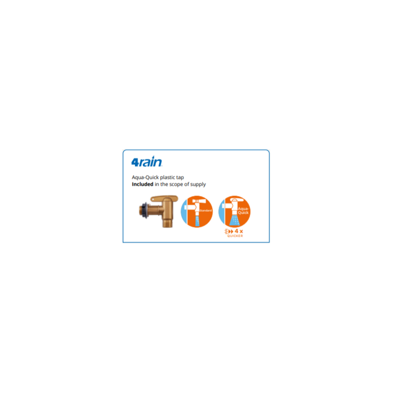 В комплекте есть всё необходимое для удобного использования: ёмкость для дождевой воды 230 л, кран «Aqua-Quick», комплект поддона для растений с уплотнителем и фильтровальная вата.