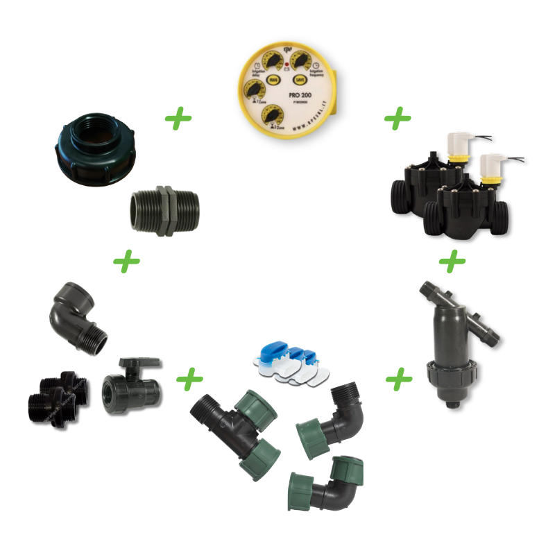 Комплект гравитационного полива из IBC-контейнера — это готовое, профессиональное решение для тех, кто хочет автоматизировать полив без подключения к электросети и без дорогостоящих монтажных работ. Данный комплект рассчитан на управление двумя независимыми зонами полива — идеальный выбор для больших огородов, теплиц или участков, где разные зоны требуют полива с различной периодичностью или интенсивностью. Комплект спроектирован таким образом, чтобы все компоненты точно подходили друг к другу — вам не нужно искать отдельные детали, проверять совместимость или тратить время на подбор элементов. Всё необходимое уже находится в одной упаковке.
