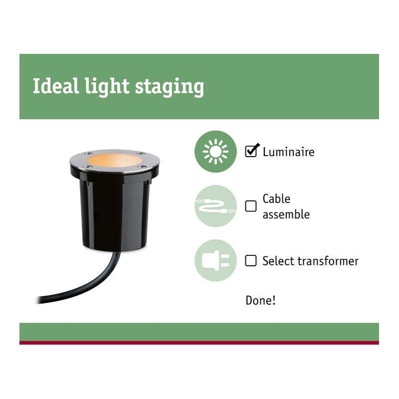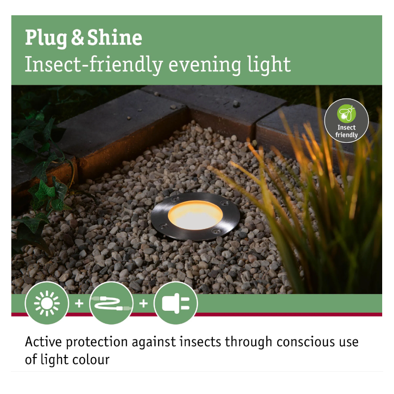 Paulmann «Plug & Shine» - надёжная система уличного освещения, разработанная для простого монтажа и безопасной эксплуатации. В системе используются специальные кабели 24 В с защитой IP68 - устойчивые к влаге, пригодные как для прокладки по поверхности, так и для заглубления до рекомендуемых 20 см. Несколько светильников или аксессуаров соединяются с помощью быстрых влагозащищённых коннекторов - без сложных электромонтажных работ. Систему легко расширять: в любой момент можно добавить дополнительные светильники или контроллеры. Одним словом: Paulmann «Plug & Shine» - безопасная, гибкая и долговечная система уличного освещения, которую просто установить и при необходимости расширить.