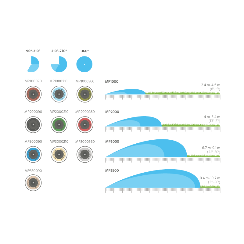 - Автоматическое выравнивание осадков - независимо от угла полива и радиуса, сопло распределяет одинаковое количество воды на квадратный метр, что упрощает проектирование системы.