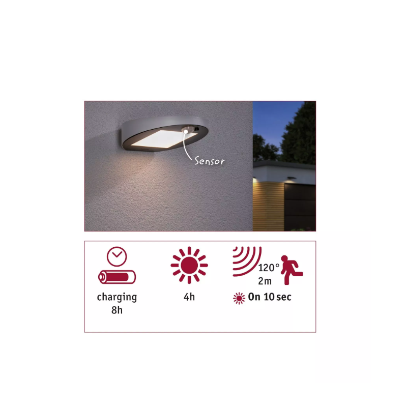 Skaists gaismeklis apgaismos jūsu mājas sienas ar siltu gaismu. Pateicoties saules baterijai, nav nepieciešams elektrības pieslēgums vai kabeļi. Baterija dienas laikā tiek uzlādēta saules gaismā. Lai ieslēgtu gaismekli, pietiek, ja kāds dienas tumšajā pusē pieiet tam klāt. 6-8 stundu uzlāde nodrošina 8-10 stundu gaismu.