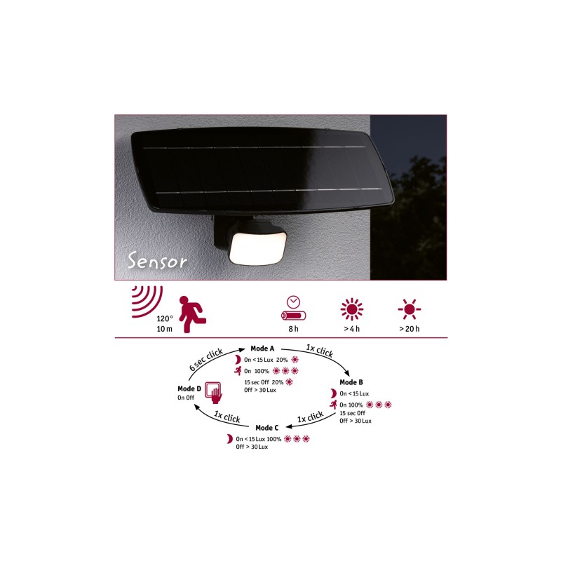 - Sienas gaismeklis Flotas ar saules bateriju un kustības sensoru